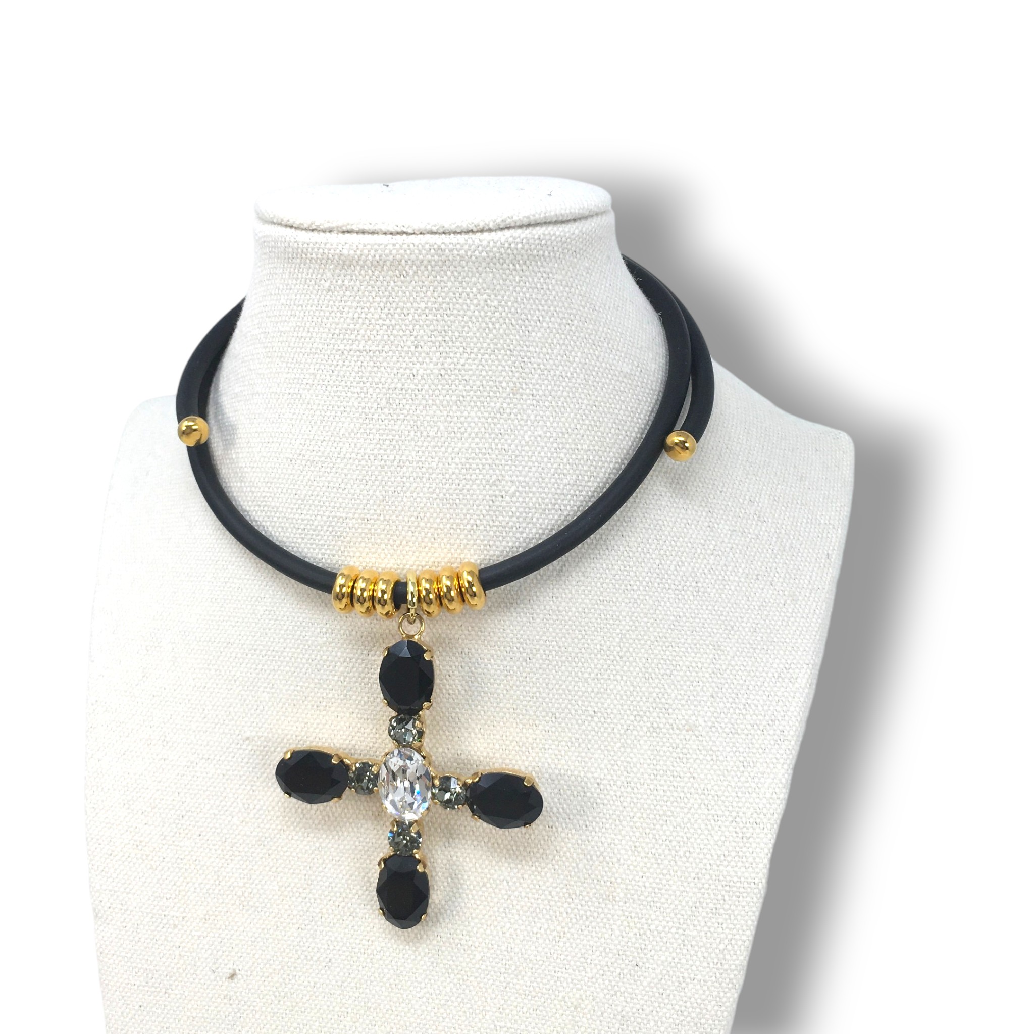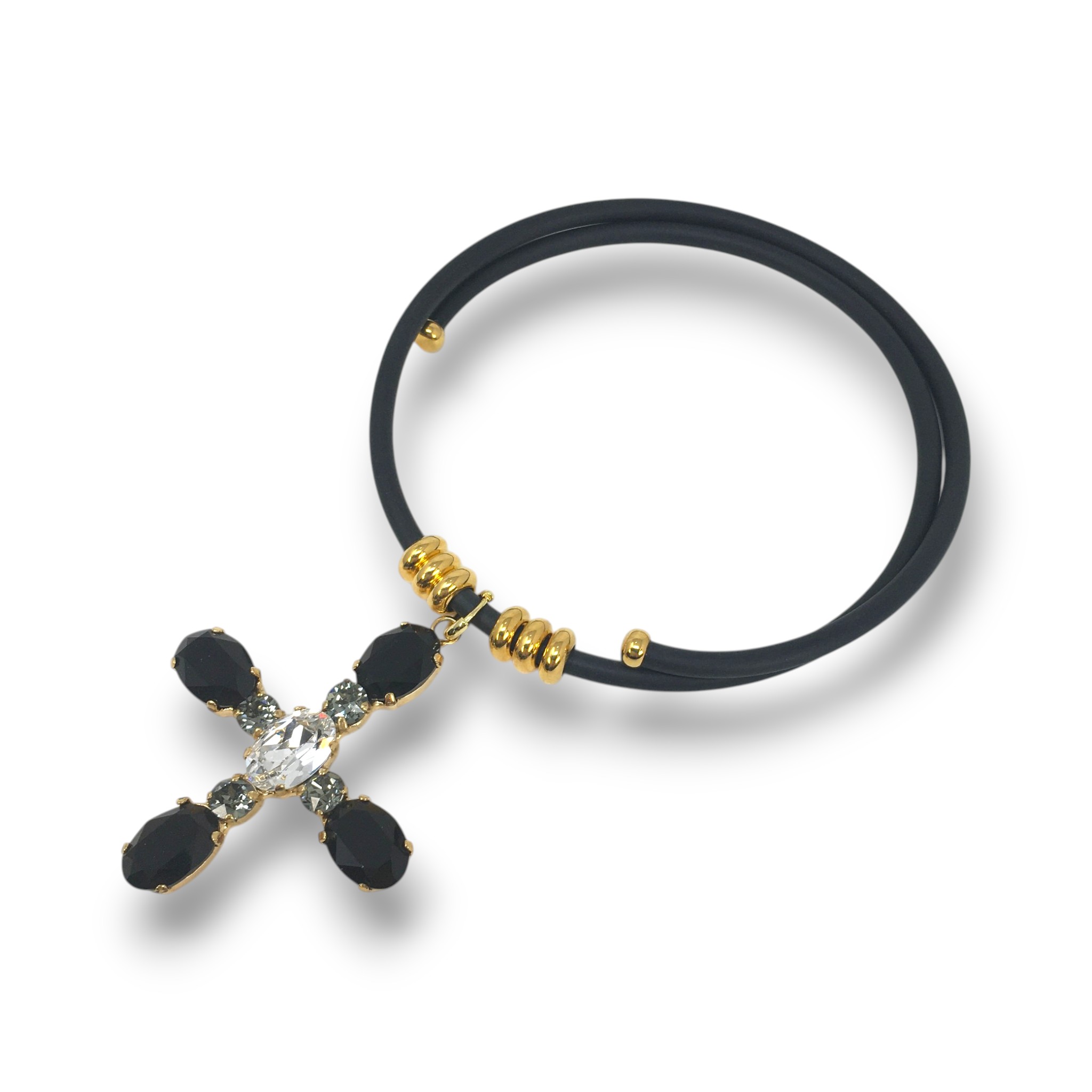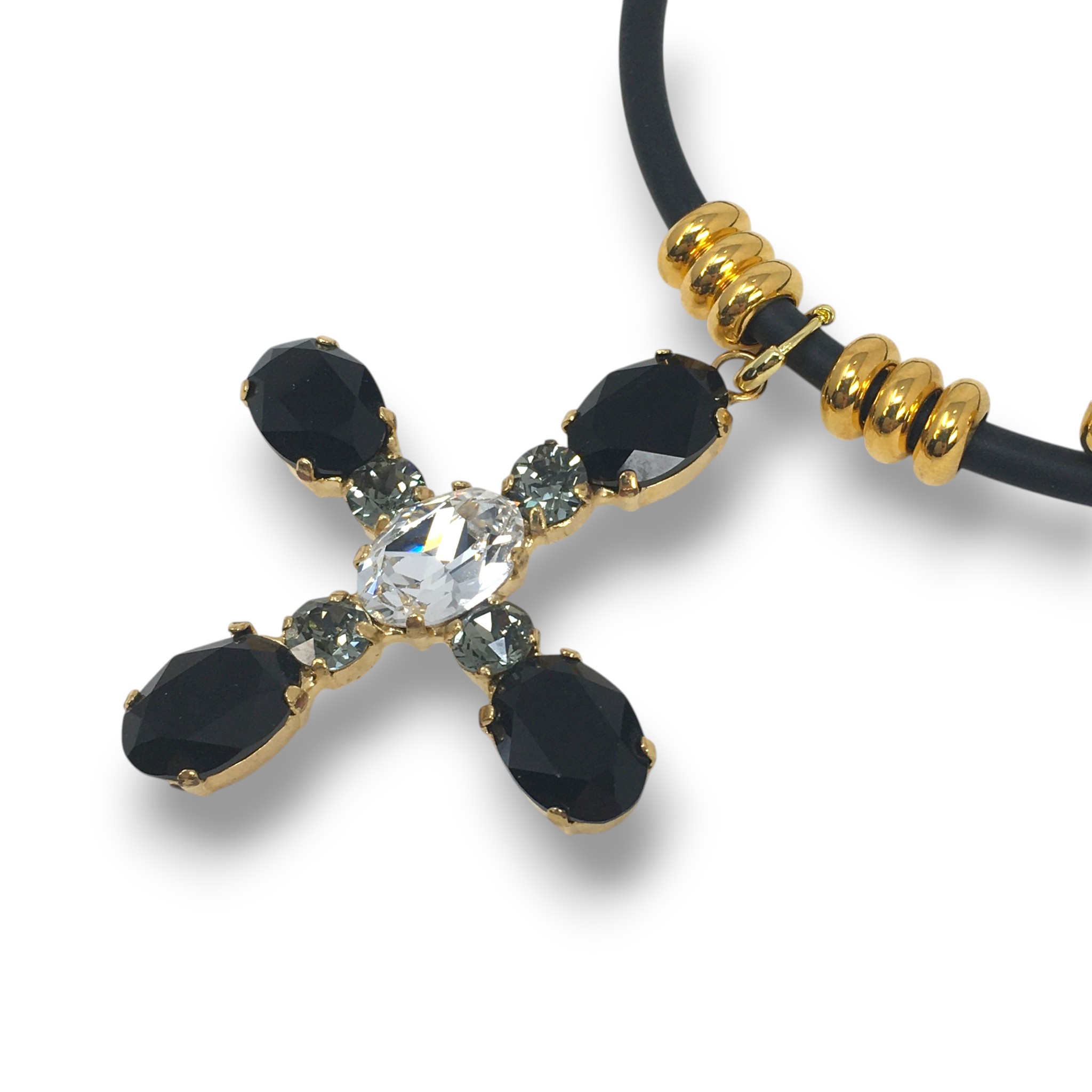 Cruz fina de cristales austríacos en tonos oscuros, ajuste cómodo y elegantes detalles dorados