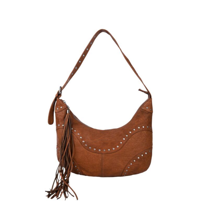 Descubre la elegancia urbana con el bolso de hombro Núnoo, elaborado en piel engrasada de alta calidad. Su diseño moderno con flecos y tachuelas metálicas aporta un toque atrevido y actual.
