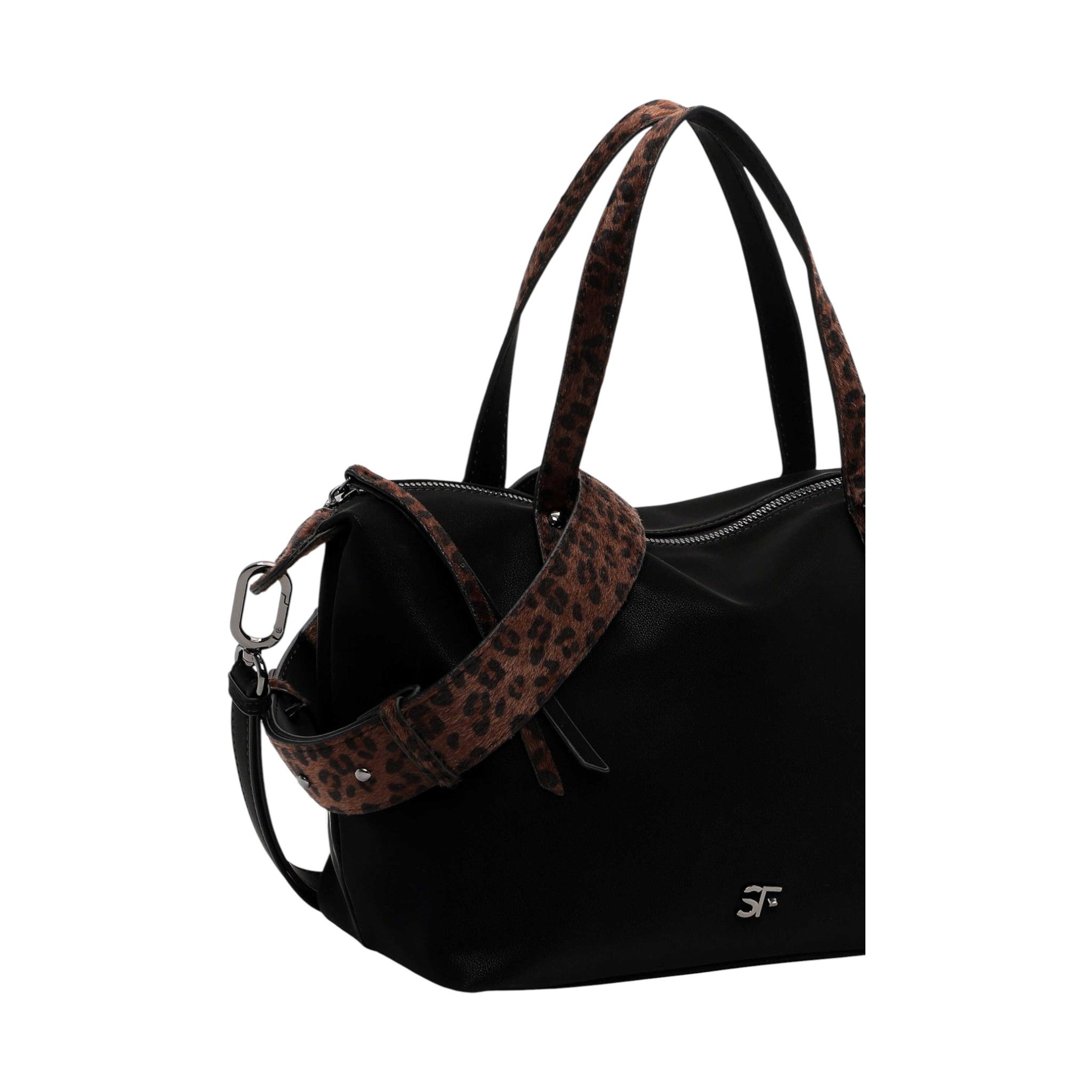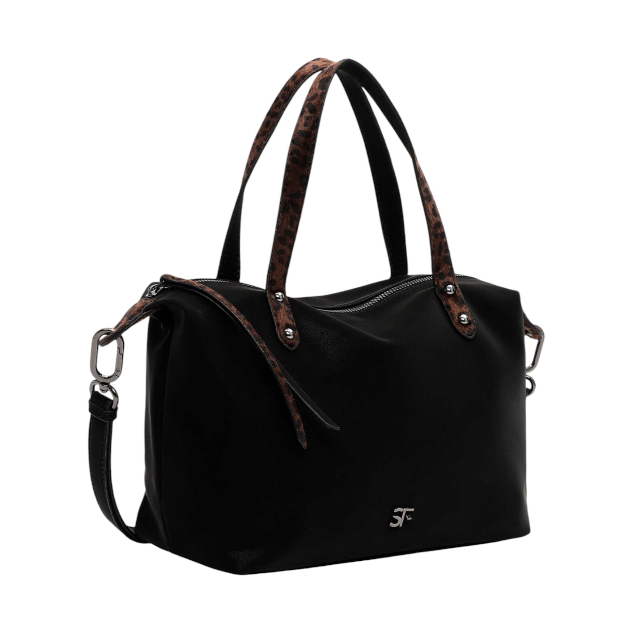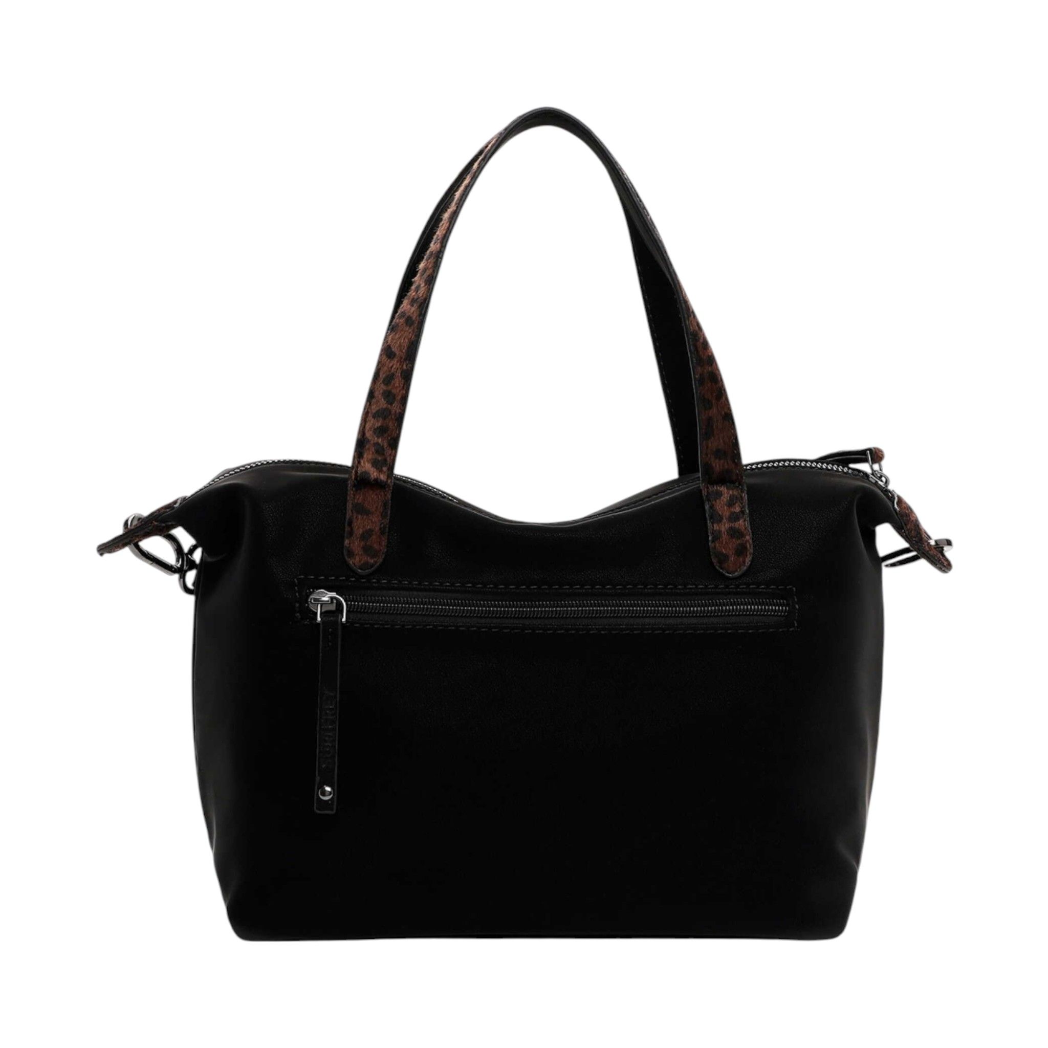 Bolso elegante y muy moderno, con detalles y asa de estampado animal print, totalmente en tendencia esta temporada, confeccionado en piel sintética de tacto suave y aterciopelado.