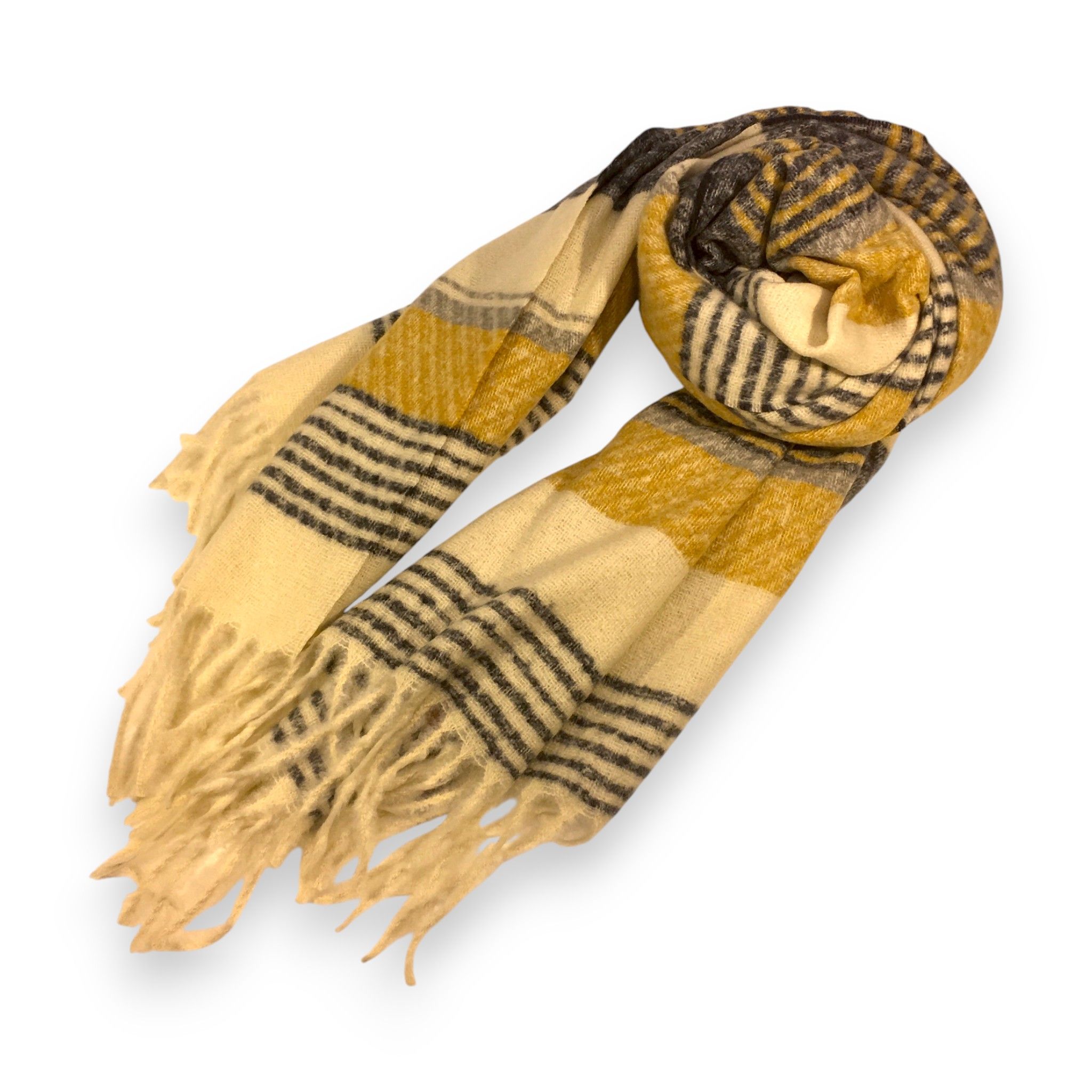 Bufanda amb serrells i estampat a ralles, clàssica i càlida, perfecta per a l’hivern.