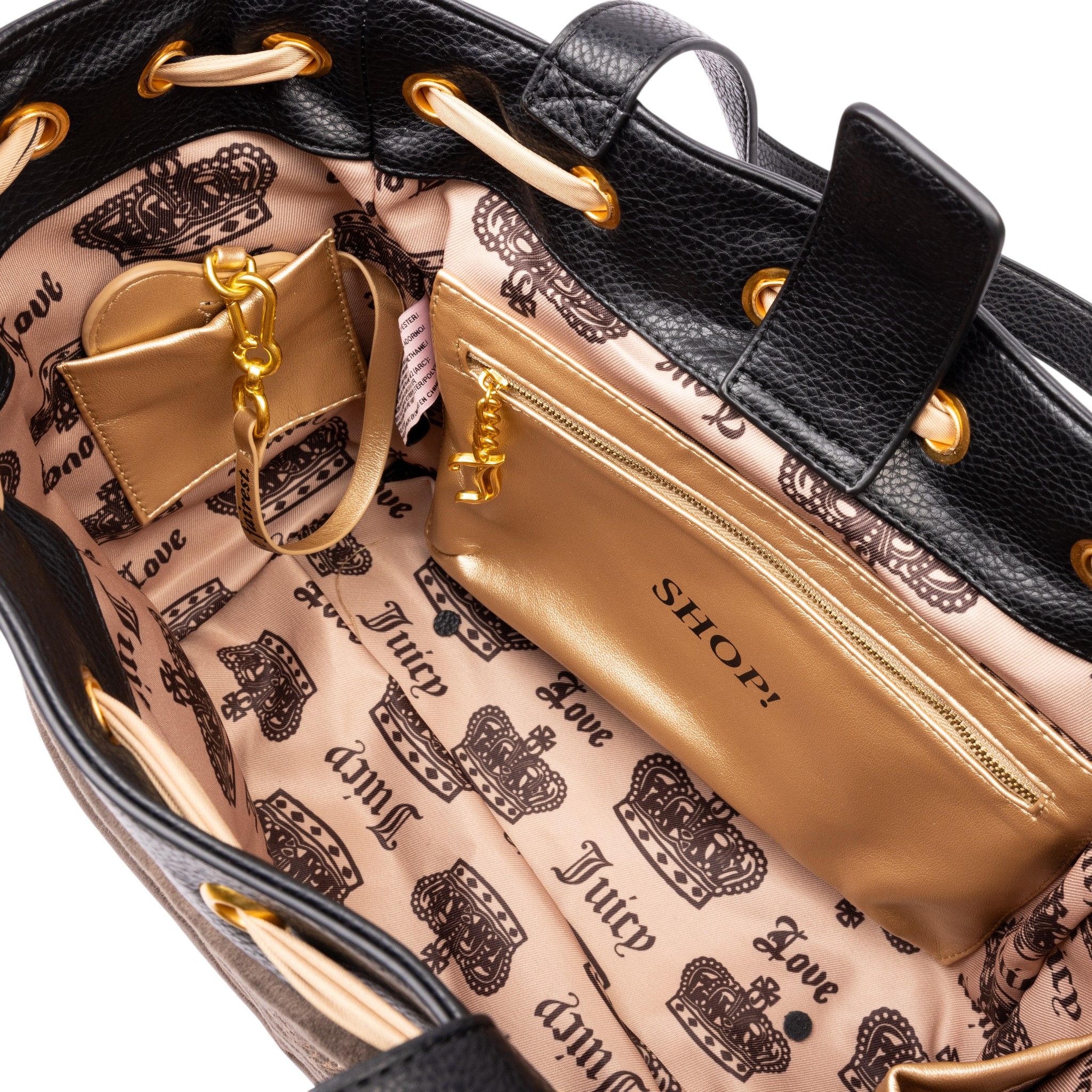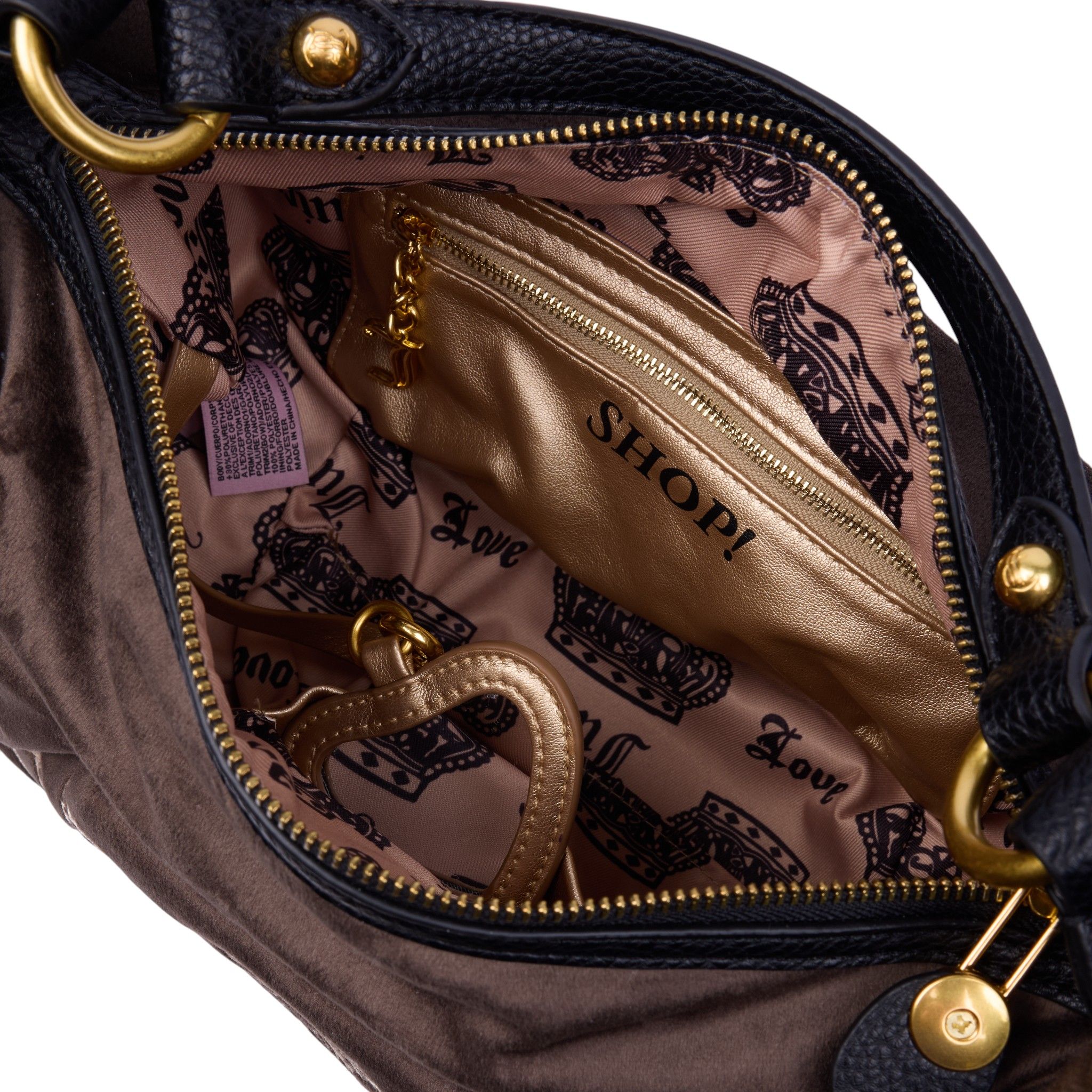Bossa Juicy Couture de vellut suau amb detalls en pell i daurats.