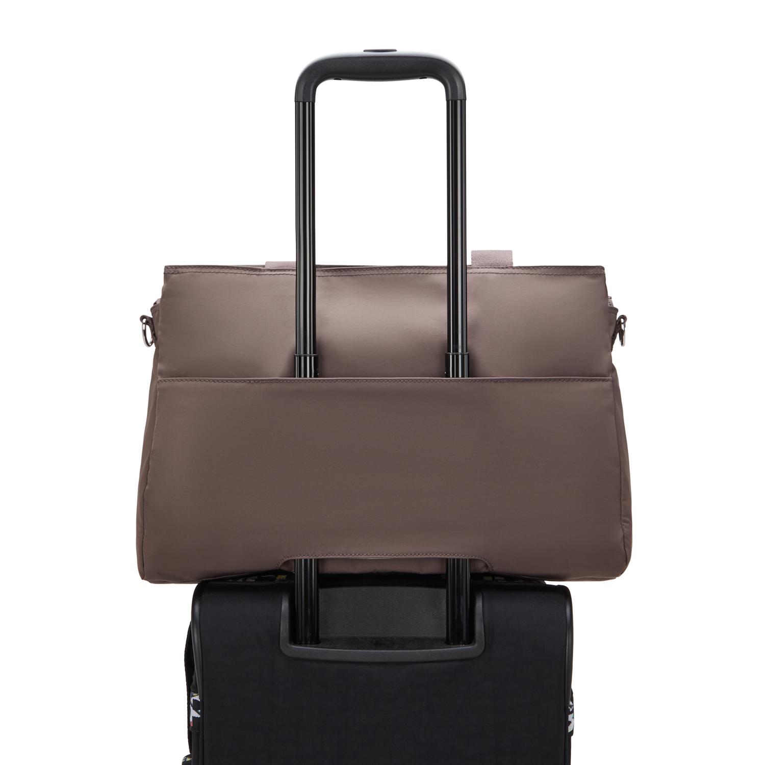 Disposa de dues butxaques laterals amb cremallera per tenir a mà petits objectes o documents addicionals. Les nanses llargues permeten portar-la còmodament a l’espatlla, i la corretja extraïble t’ofereix l’opció de portar-la com a bandolera. A més, incorpora una cinta al darrere per acoblar-la fàcilment a la maleta quan viatges.