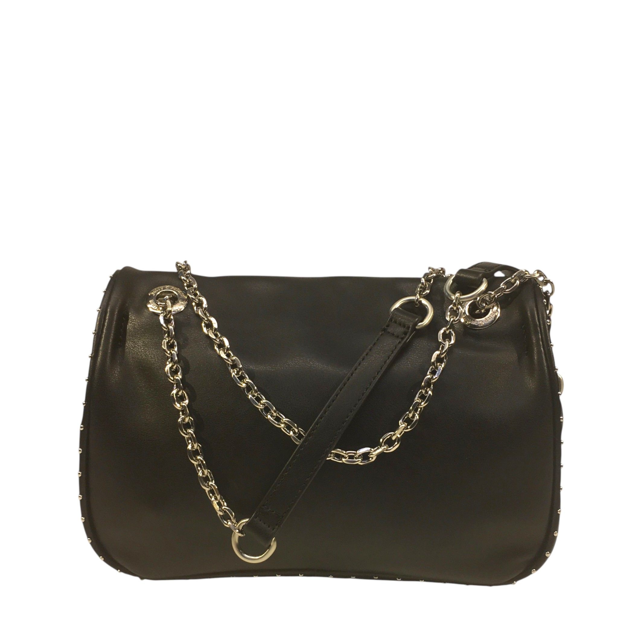 Els detalls en tatxes platejades i el nom de la marca escrit amb tatxes metàl·liques al frontal aporten un toc modern i distintiu.La nansa de cadena és regulable i permet portar-la tant a l’espatlla com creuada en mode bandolera. A l’interior hi trobaràs dos butxaques per a una organització òptima i un monederet a joc.